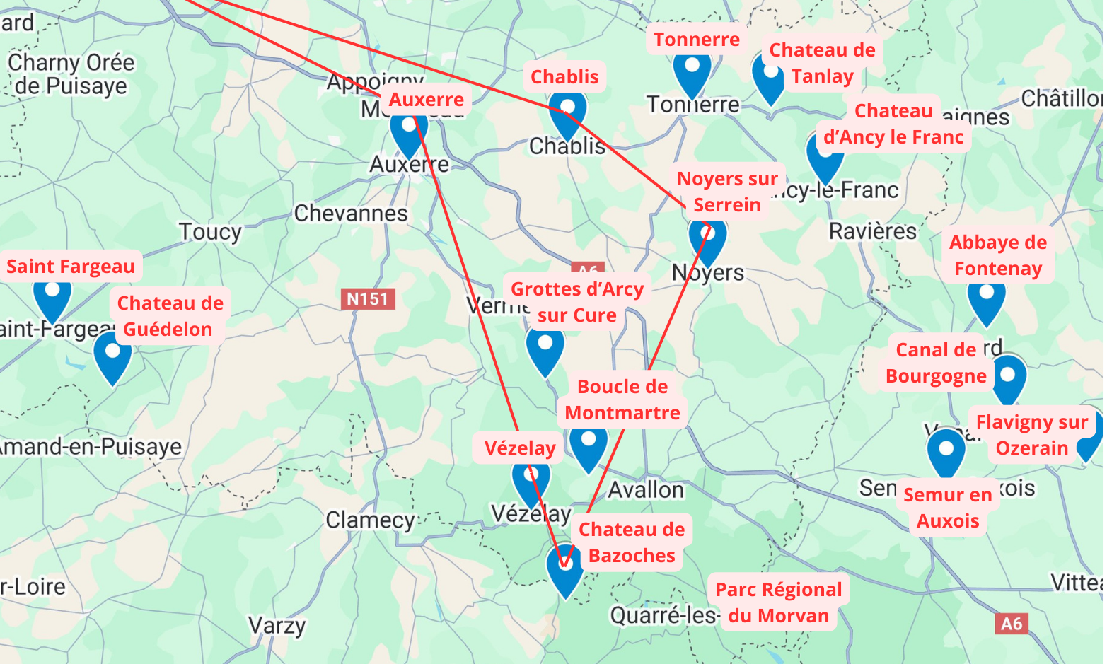 🚐 Noyers → Chablis : ~25 km, 30 min de route.